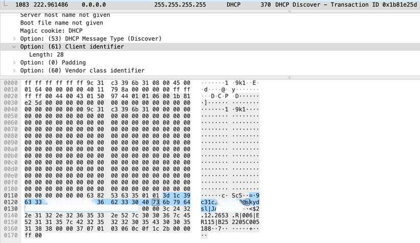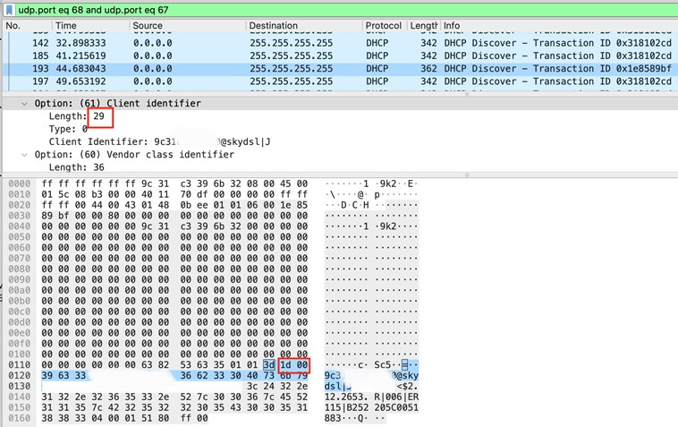 Note that JDHCP/RFC2132 option 61 length is 29 due to the “00”