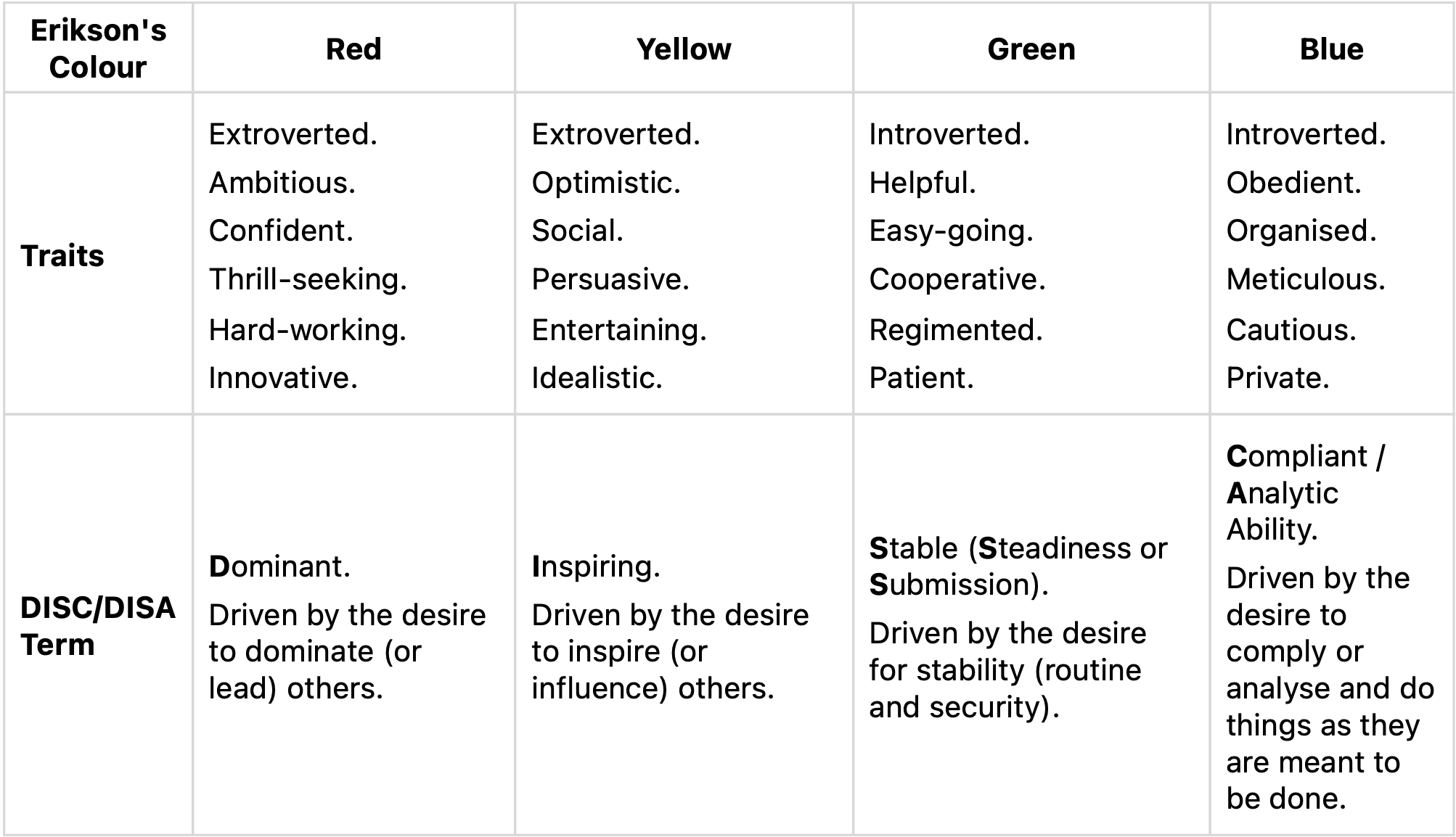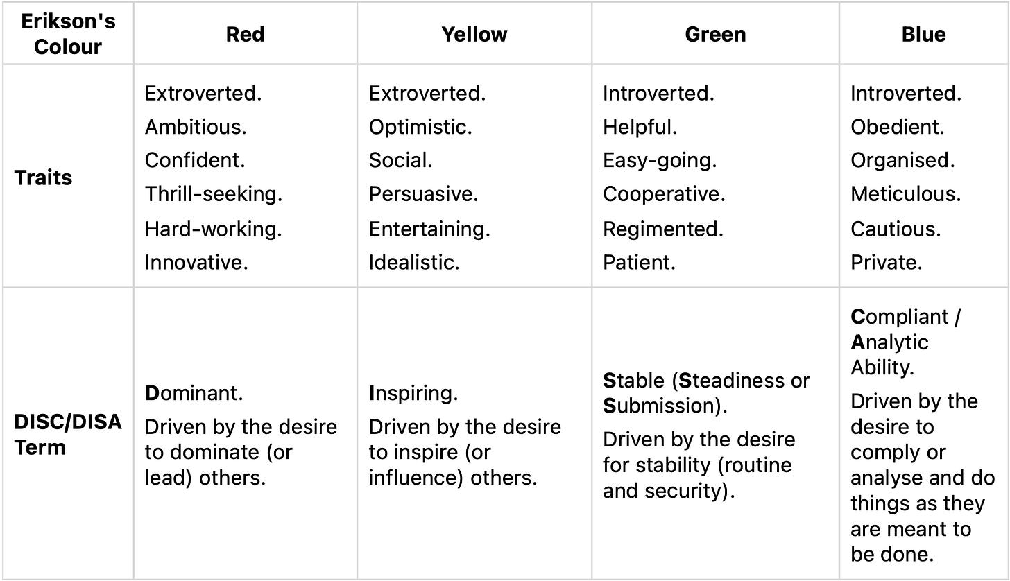 The personality traits come from the DISC theory and assessments created by William Moulton Marston. It was originally created as a tool to predict job performance, however it has wider reaching capabilities. The DISC theory was adapted by Thomas Erikson to make DISA, which looks at the blue personality as being more analytical, rather than compliant.