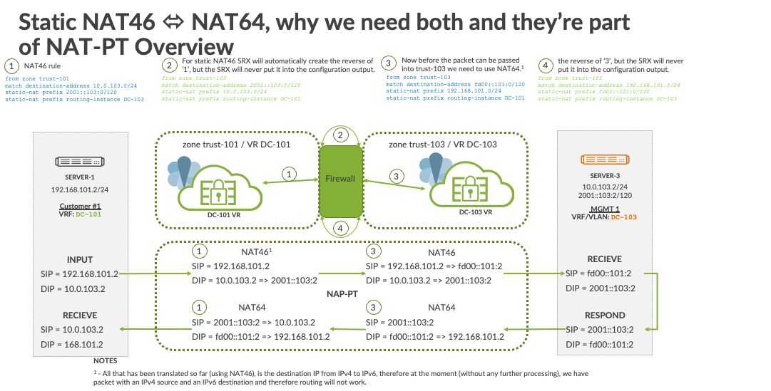 As the SRX is stateful, static NATs automatically create the reverse rule in the SRX, but never display it in the configuration. That allows for a more condensed rule base in the SRX. However, the need for NAT-PT is that, as the IP address translated using NAT46 only the destination IP has been translated IPv4 to IPv6, therefore at thew moment (without any further processing), we have a packet with an IPv4 source and an IPv6 destination and therefore routing will not work. Therefore, we need a NAT64 rule to complete the source IP translation; hence NAT-PT.