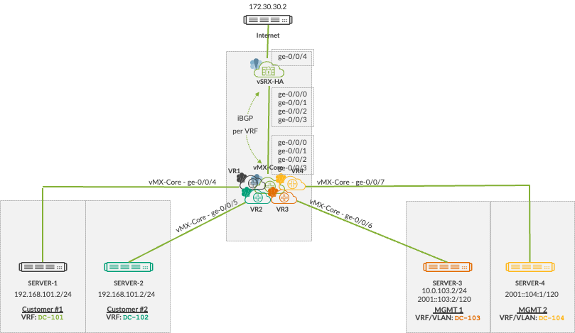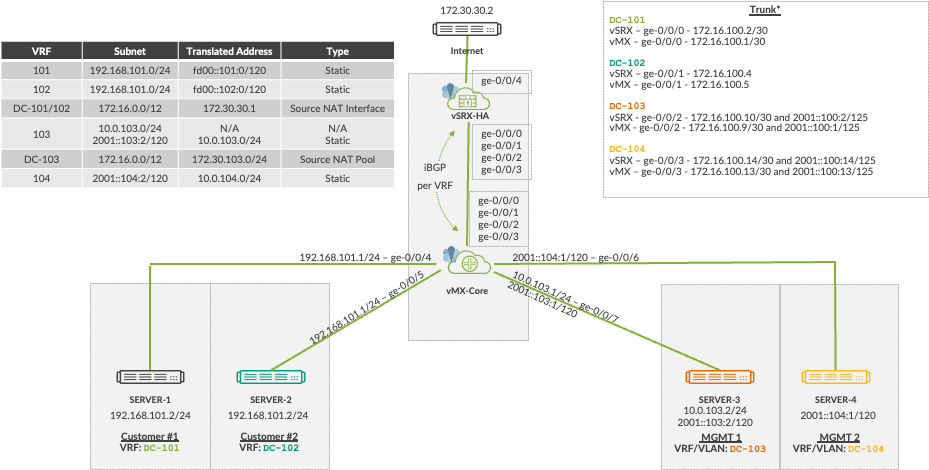 set security nat static rule-set NAT64 rule rule-1 then static-nat prefix routing-instance DC-101From this ‘reverse’ NAT64 rule, we map anything that is originated in DC-101 VR (zone trust-101) from the IP subnet 192.168.101.0/24, NAT it to IP subnet fd00::101:0/120, and put the NAT’d traffic into zone trust-103 (DC-103 VR).